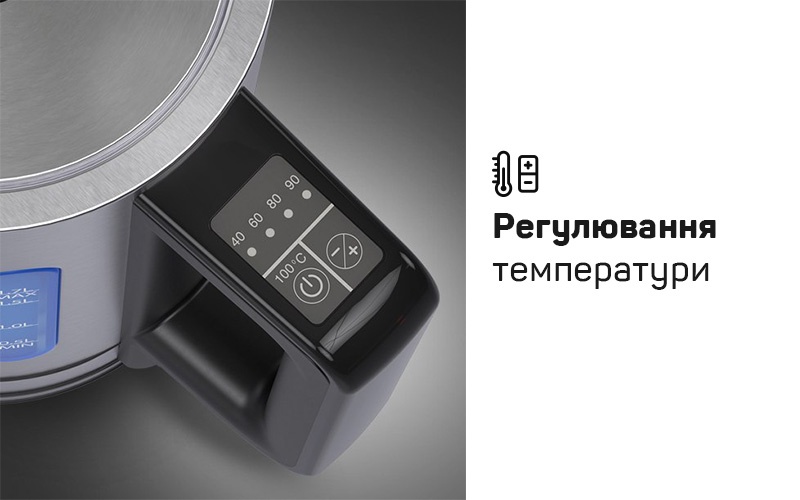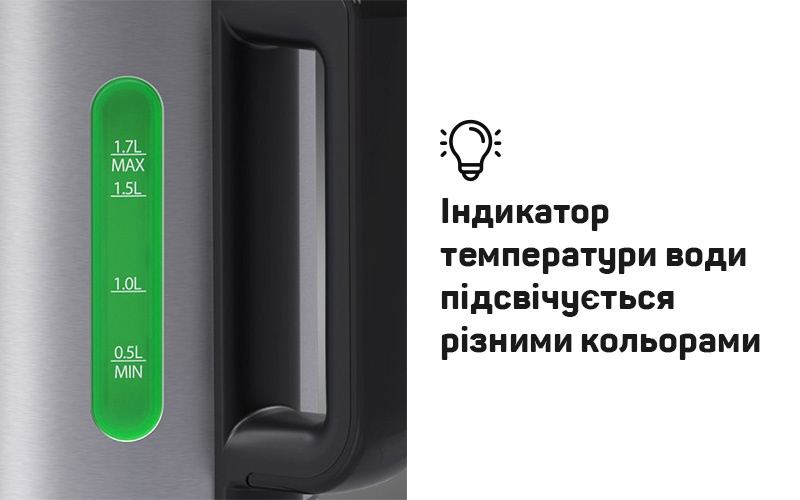 На бічній частині пристрою розташований індикатор з мірною шкалою, що показує поточний рівень води в чайнику і, залежно від обраної температури, використовує різні кольори, щоб вказати, коли вода готова для вашого улюбленого напою. Ця корисна функція дозволяє вам швидко побачити з першого погляду поточну температуру води та чи достатньо її для вашого улюбленого напою.