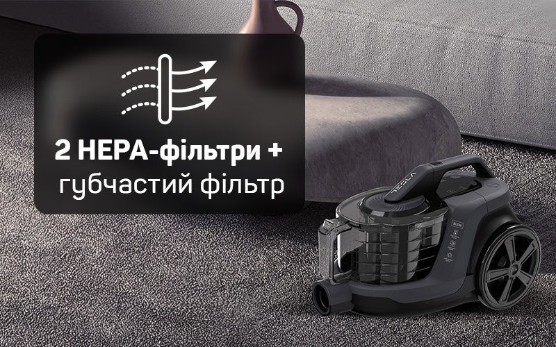 Ця модель оснащена двома HEPA-фільтрами, які вловлюють алергени та покращують якість повітря, а також додатковим губчастим фільтром, що затримує більші частинки.