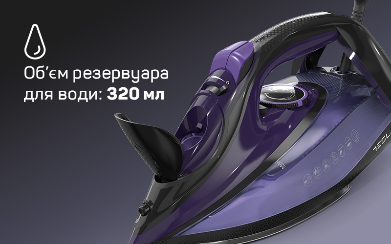 Резервуар об’ємом 320 мл забезпечує достатню кількість води для тривалого прасування без необхідності частого доливання води. Такий обсяг робить процес прасування зручнішим і ефективнішим, особливо при роботі з великим обсягом білизни.